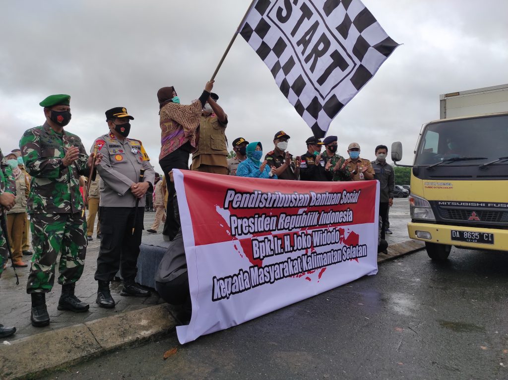 Banjarbaru-Melepaskan bantuan 20.000 paket dari Presiden RI bersama Gubernur Kalimantan Selatan, Sahbirin Noor, Sekretariat kepresidenan, Sri Yuliani, NGO jawa timur, Irfan Nurdiansyah, Kapolda Kalsel, Rikwanto, Danrem 101 Antasari, Firmansyah, Ketua PKK Kalsel, Hj. Raudatul Jannah , Banjarbaru, Senin (1/2/2021).