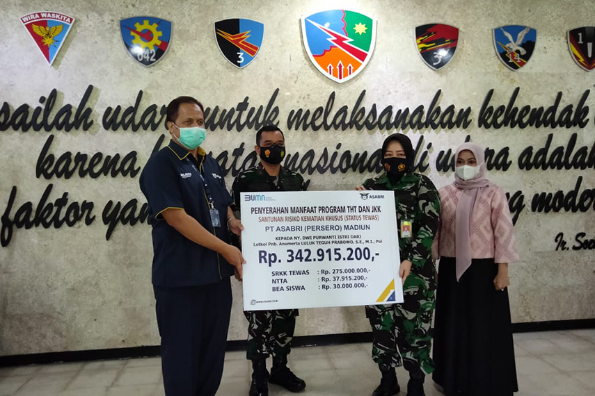 Hery Nurdi S.E Kakancab ASABRI Madiun menyerahkan manfaat Jaminan Kecelakaan Kerja sebesar Rp342.915.200,- terdiri atas Santunan Resiko Kematian Khusus (SRKK) Status Tewas sebesar Rp275.000.000,- dan Nilai Tunai Tabungan Asuransi (NTTA) sebesar Rp37.915.200,-. dan beasiswa anak sebesar Rp30.000.000,- Manfaat yang diterimakan masih mengacu pada PP 102 tahun 2015 karena kejadian meninggal dunia pada tanggal 02 September 2020, sedangkan PP 54 tahun 2020 yang berlaku saat ini mulai diundangkan/diberlakukan kepada peserta ASABRI mulai tanggal 30 September 2020