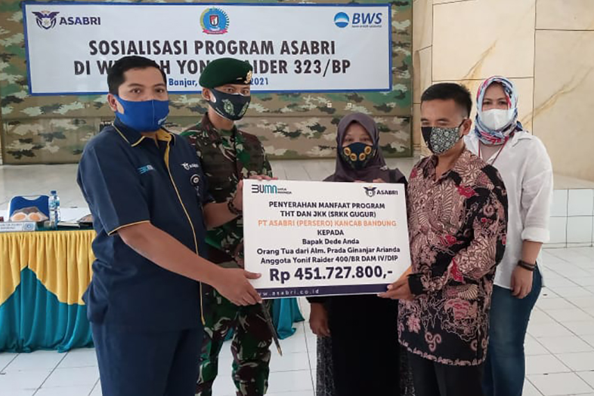 Sabtu 27 Februari 2021, bertempat di Markas Komando Yonif Raider 323/BP Kakancab PT ASABRI (Persero) Bandung Simon P Semedi bersama Komandan Bataliyon Mayor Inf. Afriandy Bayu Laksono, S.Sos,M.I.Pol menyerahkan hak manfaat Asabri berupa Santunan Risiko Kematian Khusus (SRKK) Gugur dan Nilai Tunai Tabungan Asuransi (NTTA).