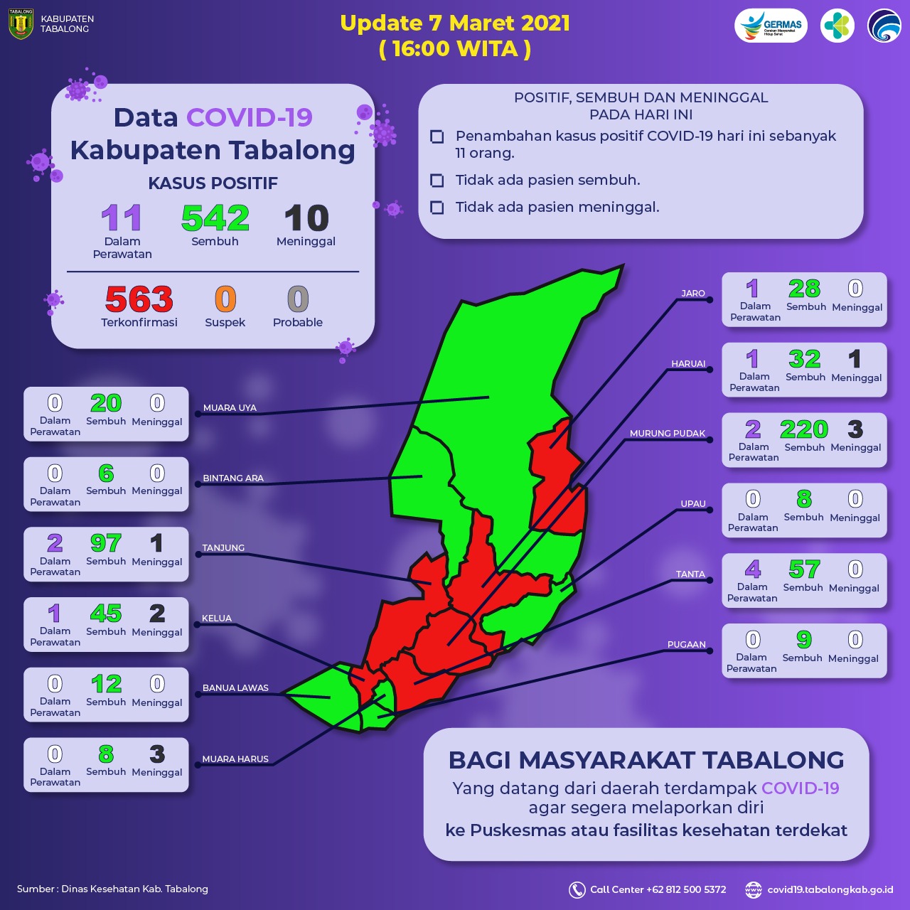 11 pasien positif berasal dari 6 kecamatan dengan rincian 4 orang berasal dari kecamatan Tanta, 2 orang dari Tanjung, 2 orang dari Murung Pudak serta masing-masing 1 orang berasal dari kecamatan Jaro, Haruai dan kecamatan Kelua.