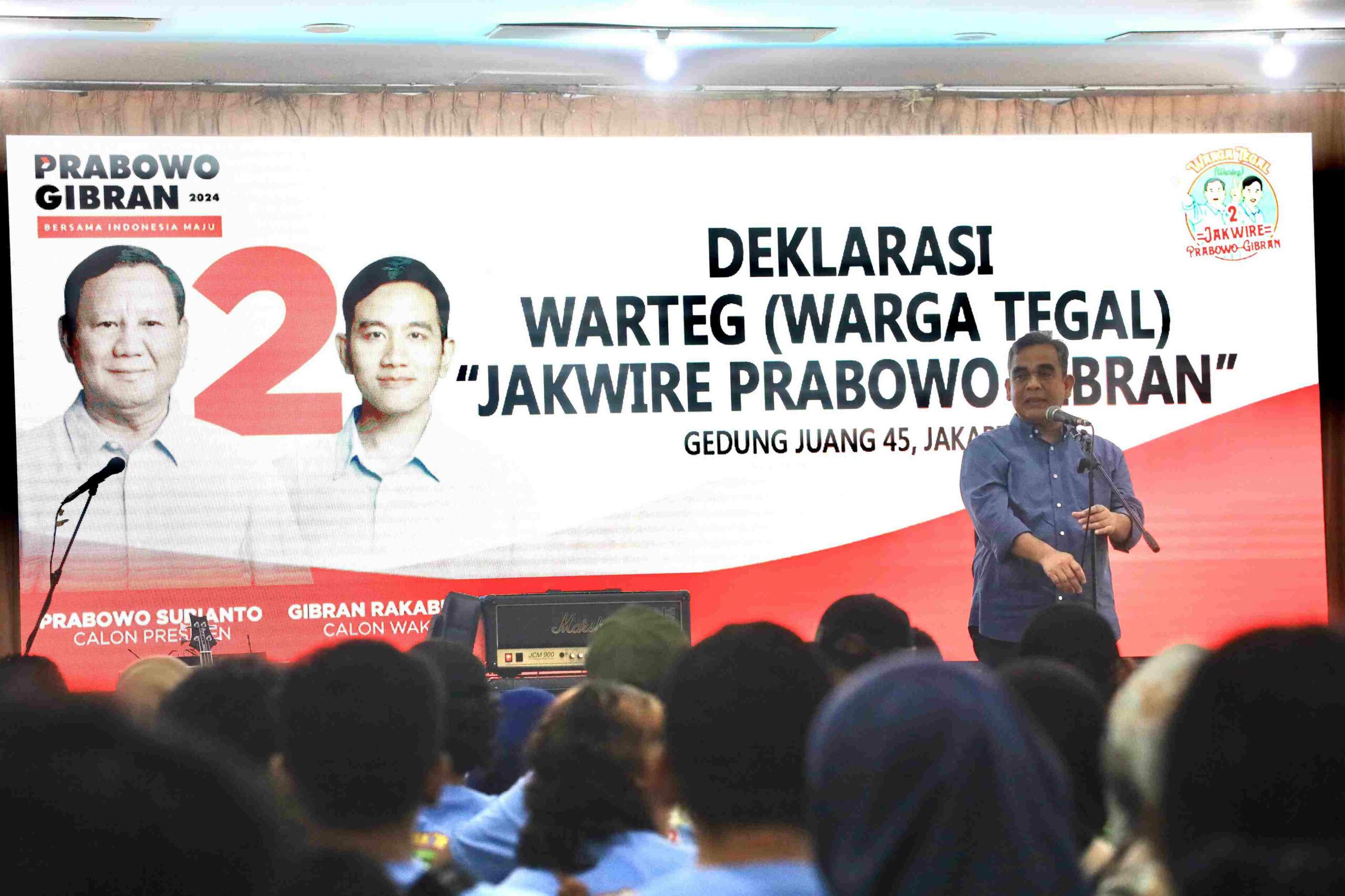 “Alhandulillah pada hari ini kami dari teman-teman dan sodara kita Warung Tegal (wateg) yang ada di Jobedetabek menyatakan dukungan support terhadap calon presiden nomor 2 Prabowo-Gibran. Atas dukungan itu kami snagat berbesar hati, berbangga dan berterima kasih kepada komunitas warga Tegal, warung Tegal yang dengan tulus memberikan support dan dukungannya kepada kami,” kata Muzani.