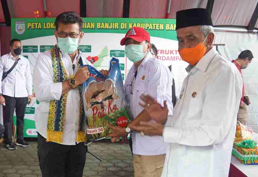 Bantuan Kementan diserahkan secara simbolis kepada Kadis Tanaman Pangan dan Hortikultura (TPH) Kalsel Syamsir Rahman dan Bupati Banjar, KH Khalilurrahman. Bantuan berupa sembako dan bibit padi untuk lahan seluas 50 ribu hektar.