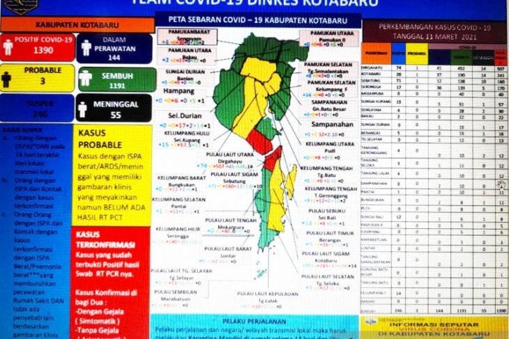 Kotabaru – Kabupaten Kotabaru melaporkan 10 kasus baru positif pada Kamis 11 Maret 2021, dan pada hari yang sama 10 pasien dinyatakan sembuh.