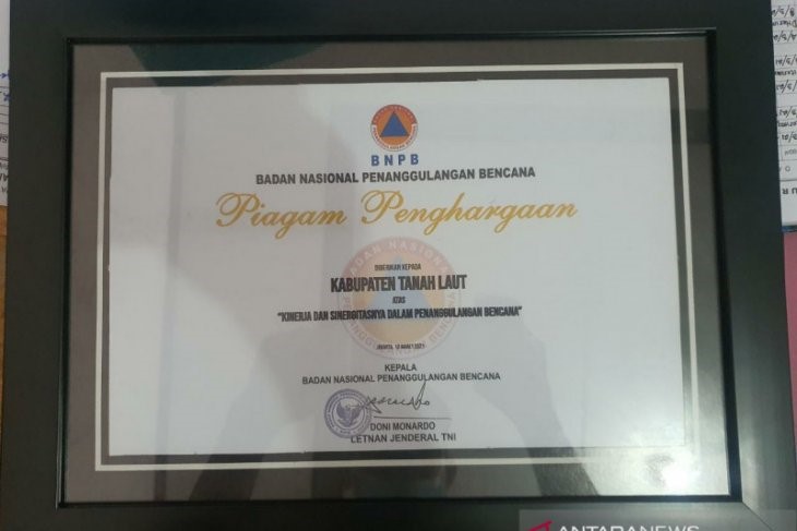 Tanah Laut District, South Kalimantan, received an award certificate from the National Disaster Mitigation Agency (BNPB) for it performance and synergy in disaster management in the category of the district government, Wednesday (March 10, 2021).