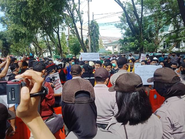 Banjarmasin– DPRD Kalsel di bulan Juli kmbali menerima aksi demo – sebelumnya gabungan LSM demo menolak RUU HIP. Hari ini, Senin (13/7/2020) ratusan massa dari unsur organisasi kepemudaan dan mahasiswa Lingkar Studi Ilmu Sosial Kemasyarakatan ULM Banjarmasin mendatangi DPRD Kalsel. Dengan isu tuntutan: tolak RUU Omnibus Law