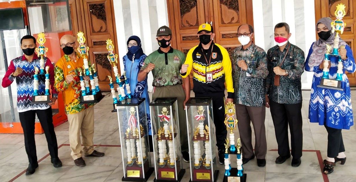 Kapten Inf Salim, Dankima Yonif 623/BWU yang menerima piala dari Bapak Gubernur Kalsel H. Sahbirin Noor yang didampingi oleh Kadispora Provinsi Kalsel untuk kategori jarak 20 Km, bertempat di Mahligai Pancasila Banjarmasin, Kamis (16/9/21).