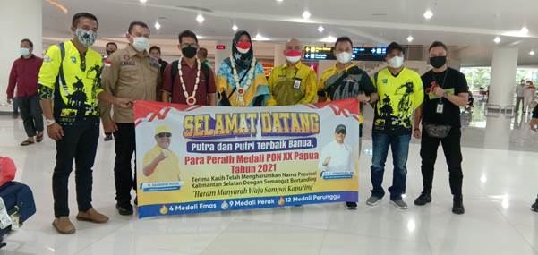 Banjarbaru – Kontingen PON Kalsel sudah kembali ke Banua. Kedatangannya langsung disambut Kadispora Kalsel Hermansyah mewakili Gubernur Kalsel H Sahbirin Noor, Jumat (15/10/2021) di Bandara Internasional Syamsudin Noor Banjarmasin di Banjarbaru.