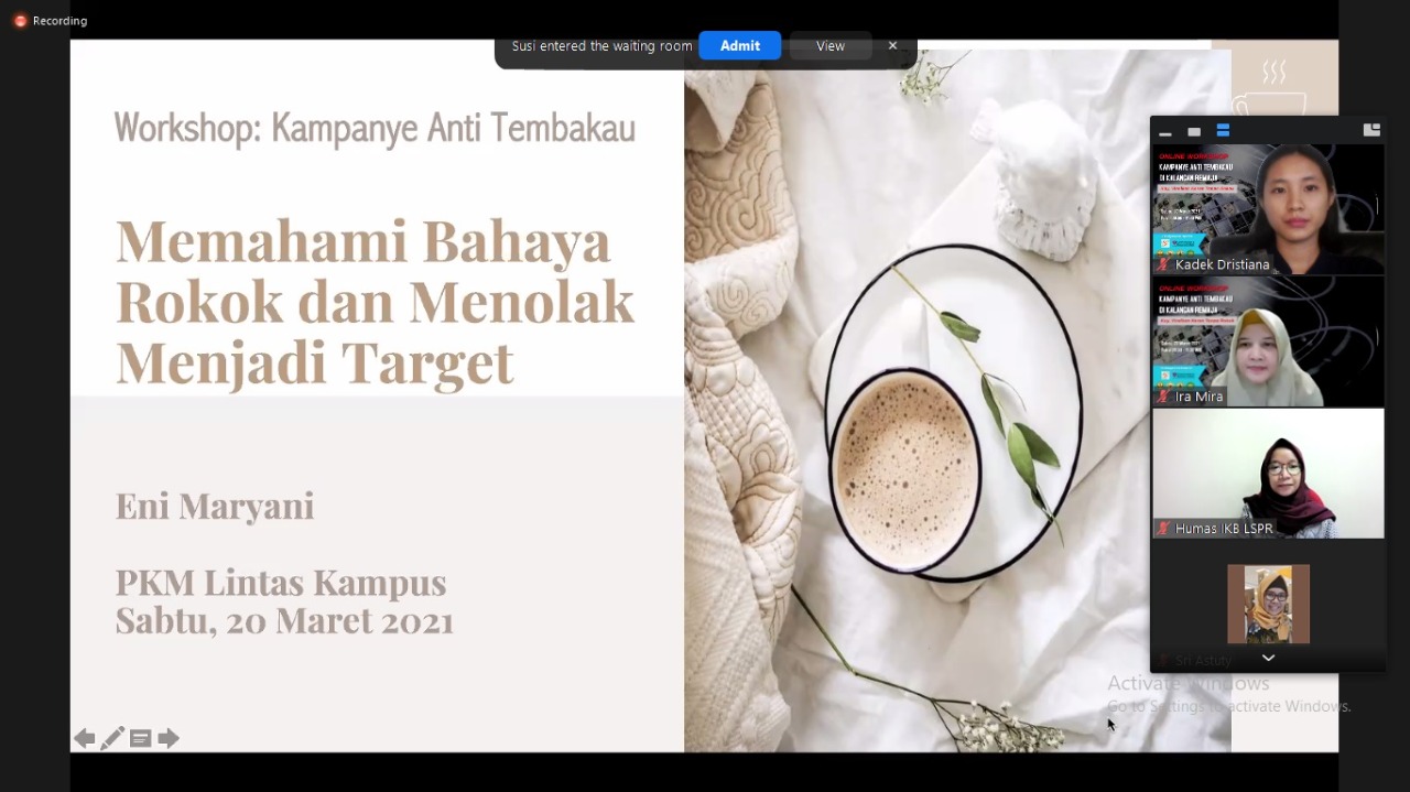 Sementara itu workshop tersebut diadakan pada hari Sabtu, 20 Maret 2021 diikuti oleh 97 orang mahasiswa dari berbagai universitas dan menghadirkan Dr Eni Maryani sebagai narasumber dalam tema “Memahami Bahaya Rokok dan Menolak Menjadi Target” sebagai pembekalan kepada mahasiswa tentang isu rokok.