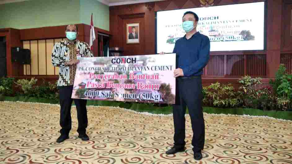 Pabrik semen asal Tiongkok yang beroperasi di Seradang Haruai, Kabupaten Tabalong ini memberikan bantuan berupa 4.000 sak semen untuk kegiatan rehabilitasi dan rekonstruksi infrastruktur yang terdampak banjir.