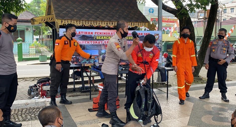 Banjarmasin, Polda Kalsel – Dalam rangka meningkatkan penanganan terhadap korban bencana alam serta kecelakaan yang terjadi di darat dan perairan yang memerlukan tindakan cepat dalam melakukan pencarian dan pertolongan, Direktorat Samapta Polda Kalimantan Selatan (Kalsel) melaksanakan latihan kemampuan Search And Rescue (SAR), Selasa (24/8/2021) pukul 09.00 Wita.