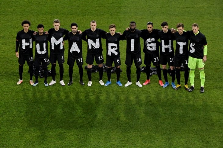 Tim Jerman berbaris sebelum kickoff dalam pertandingan pembukaan kualifikasi Piala Dunia melawan Islandia di Duisburg pada Kamis dengan mengenakan baju bergambar deretan huruf bertuliskan “HAK ASASI MANUSIA”.