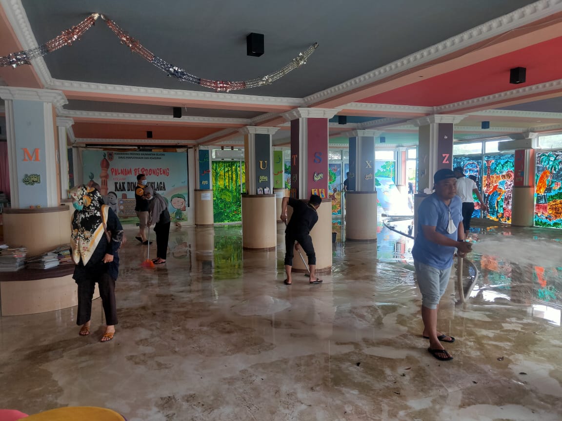 Kalsel-Perpustakaan milik Dinas Perpustakaan dan Kearsiapa (Dispersip) Kalimantan selatan  mulai dibersikan Setelah sepekan lebih terendam banjir, jajaran  mulai membersihkan sejumlah fasilitas yang terdampak.