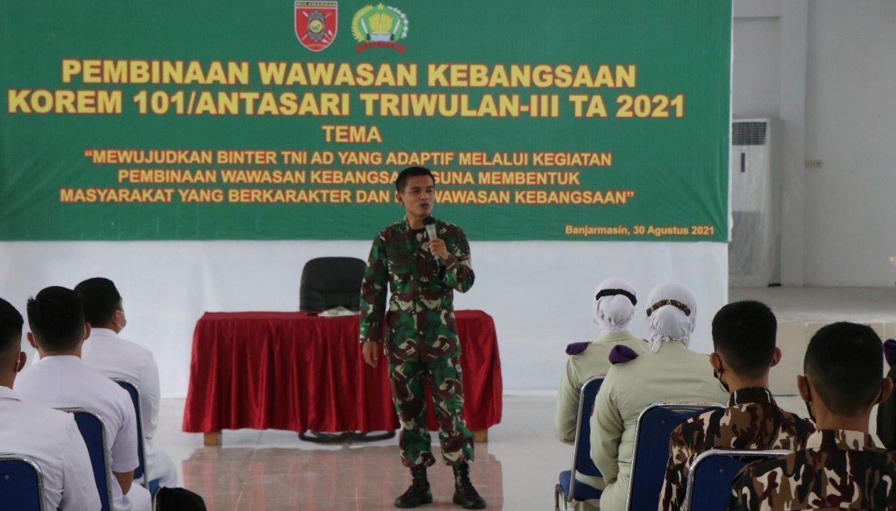 Dalam rangka untuk membentuk karakter bangsa maka Korem 101/Antasari melaksanakan kegiatan pembinaan wawasan kebangsaan tahun 2021, yang dilaksanakan di Aula Korem 101/Antasari Jl. Jend Sudirman Banjarmasin Tengah Kota Banjarmasin, Senin (30/8/21).