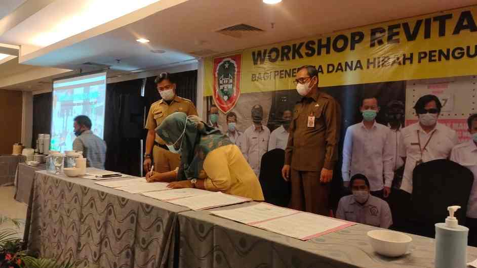Pada acara pembukaan workshop, dilakukan penandatanganan Naskah Perjanjian Hibah Daerah (NPHD) dari DPMD Provinsi Kalsel kepada perwakilan BUMDes.