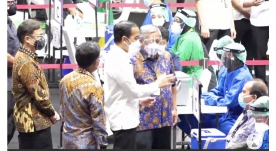 Jakarta – Menteri Komunikasi dan Informatika Johnny G. Plate mendampingi Presiden Joko Widodo meninjau program vaksinasi untuk wartawan yang hari ini digelar