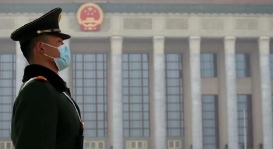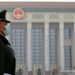Seorang petugas keamanan bersiaga di depan Balai Agung Rakyat, Beijing, pada pembukaan Sidang Umum Majelis Permusyawaratan Politik Rakyat China (CPPCC), Kamis (4/3/2021),